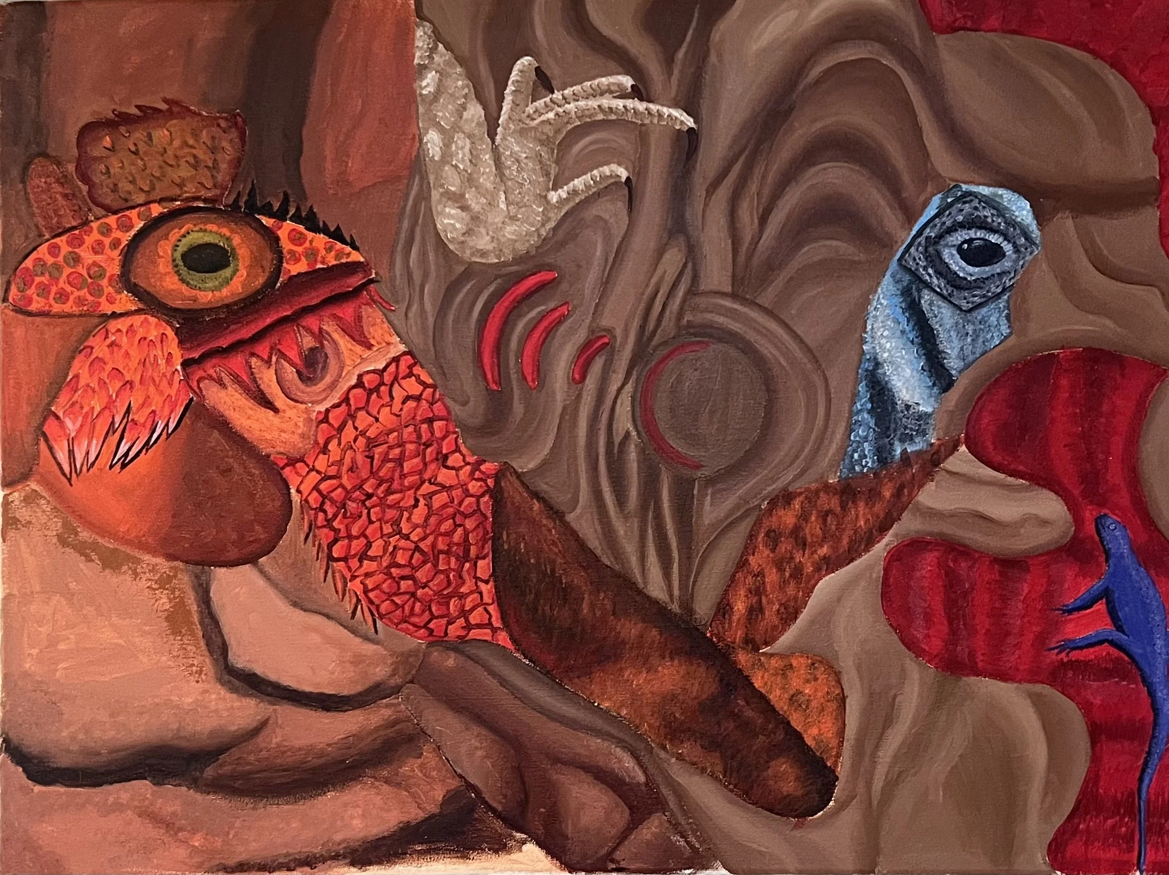 I painted my bearded dragon, Mushu, to show different parts of me. I broke him into shapes and colors to show feelings like calmness, strength, and other emotions that change inside me.