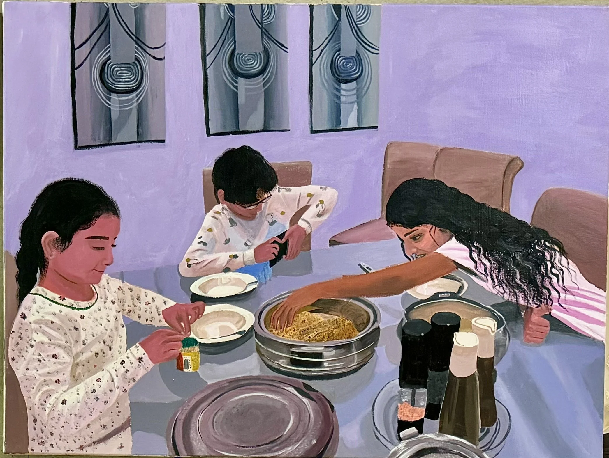 This painting was inspired by the artist David Hockney. I wanted to create a scene from everyday life, similar to how he paints people and moments around him. The painting shows my siblings eating together, but one of them is using his phone like an “iPad kid.” Through this work, I wanted to show how the experience of eating together has changed compared to before.